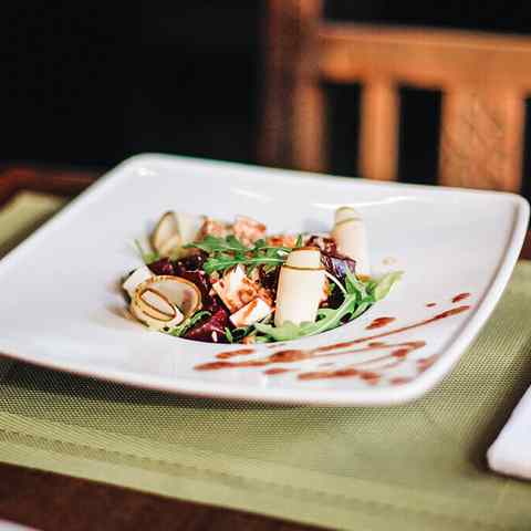 Меню ресторана объединяет вкусы белорусской, европейской и узбекской кухни. Гостям предлагают сочные блюда на мангале, авторские салаты, легкие закуски и изысканные десерты. В баре представлен широкий ассортимент напитков: от классических коктейлей до эксклюзивных вин и крепкого алкоголя.